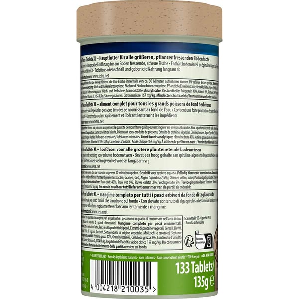 Tetra Pleco XL Tablets ist ein Ausgewogenes, nährstoffreiches Premium-Tablettenfutter für alle größeren pflanzenfressenden Bodenfische. Diese Tablets sind eine optimale und abwechslungsreiche Ernährung für alle größeren pflanzenfressenden Bodenfische.