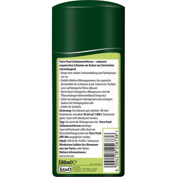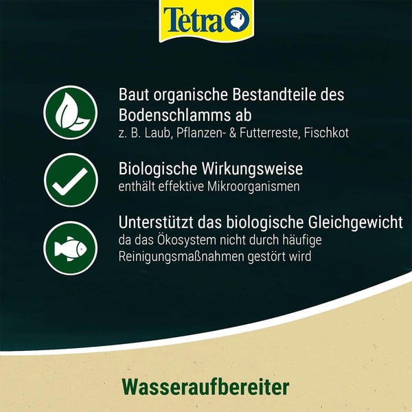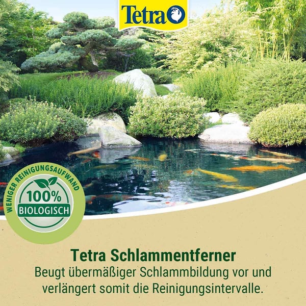 Der Tetra Pond Schlammentferner baut in Ihrem Teich zuverlässig organischen Bodenschlamm ab. Die enthaltenen hochaktiven Bakterien und Enzyme unterstützen das biologische Gleichgewicht. Die Sichttiefe im Teich wird durch den Abbau deutlich optimiert. Auch die Reinigungsintervalle können mittels des Tetra Pond Schlammentferners verlängert werden. Empfehlenswert ist die Anwendung des Produktes insbesondere bei starkem Laubfall und höherem Fischbesatz. Mehr noch sollten Sie eine Teichbelüftung verwenden, da bei dem Abbau der Verunreinigungen Sauerstoff verbraucht wird.