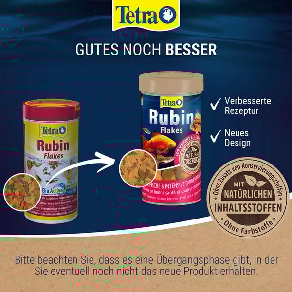 Mit hochwertigen natürlichen Inhaltsstoffen und der BioActive Formel bietet Tetra Rubin Flakes eine Ernährung, die ohne Farbstoffe und Konservierungsstoffe auskommt. Die hochverdaulichen Flocken tragen zu einer besseren Wasserqualität bei und sorgen dafür, dass das Wasser in deinem Aquarium sauber und klar bleibt.