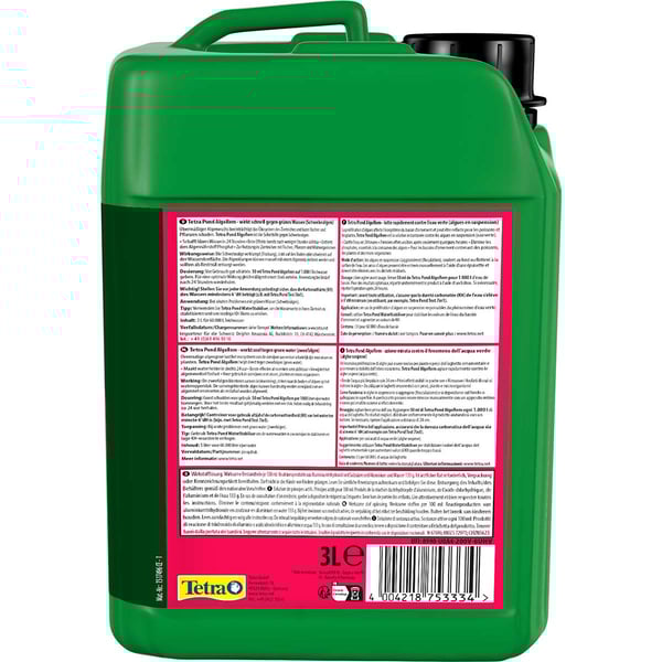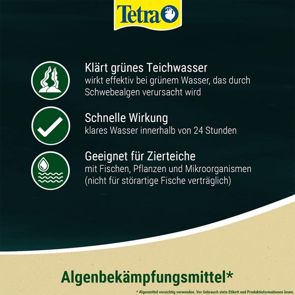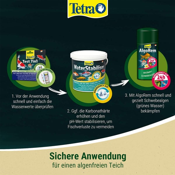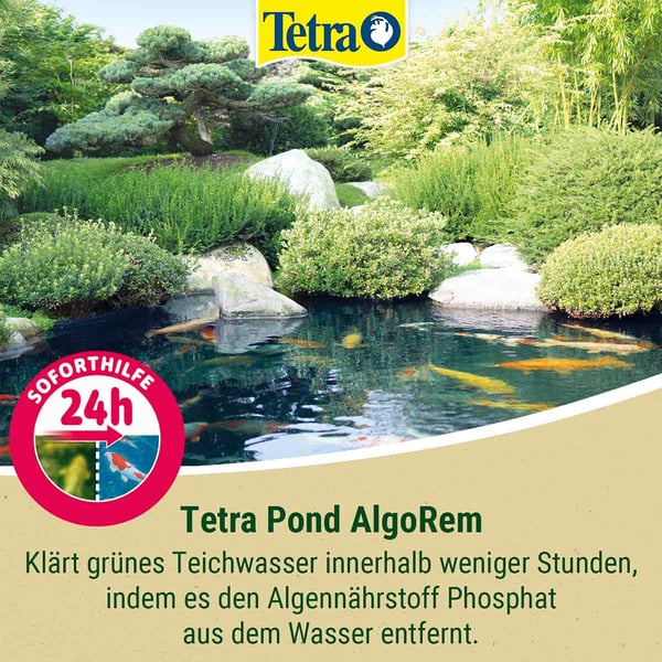 Übermäßiger Algenwuchs beeinträchtigt das Ökosystem Gartenteich und kann Fischen und Pflanzen schaden. Bei starkem Algenwachstum und Grünfärbung (Schwebealgen) des Wassers wird Tetra Pond AlgoRem einfach ins Wasser gegeben. Das Mittel lässt die Schwebealgen verklumpen (Flockung), so dass sie leichter manuell entfernt oder vom Filter aufgenommen werden können. Es schafft klares Gartenteichwasser innerhalb von 24 Stunden, wobei erste Effekte bereits nach wenigen Stunden sichtbar sind.