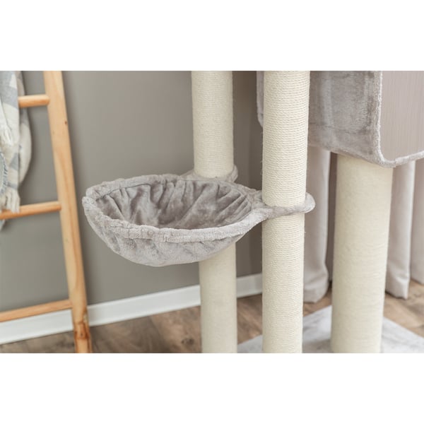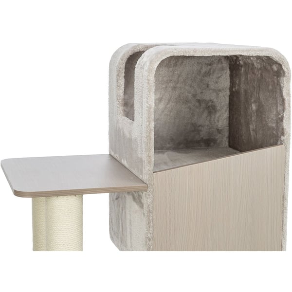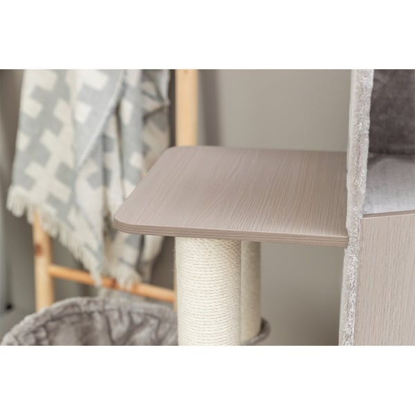 Der Kratzbaum Marina vereint dekorative MDF-Elemente in Holzoptik mit weichem Plüsch und widerstandsfähiger Jute. Diese Materialien bieten deiner Katze die Möglichkeit, nach Herzenslust zu kratzen und sich auf den kuscheligen Flächen auszuruhen. So wird der Kratzbaum zum perfekten Ort für Alltagsspaß und entspannte Pausen.