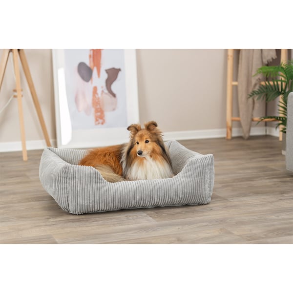 Der Bezug des Bettes ist aus Polyester in einer ansprechenden Breitcord-Optik gefertigt. Er fühlt sich nicht nur angenehm an, sondern ist auch strapazierfähig und langlebig. Die Schaumstoffflocken-Füllung im Randbereich sorgt für zusätzliche Gemütlichkeit und schützt vor Zugluft.