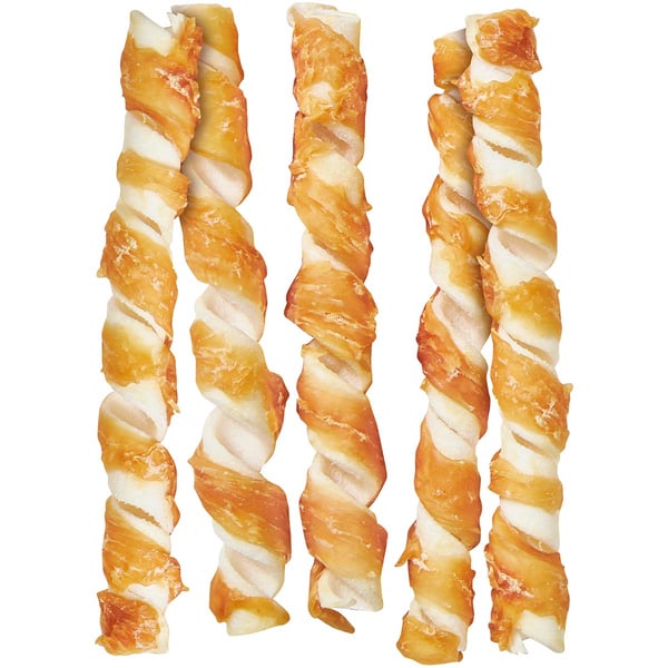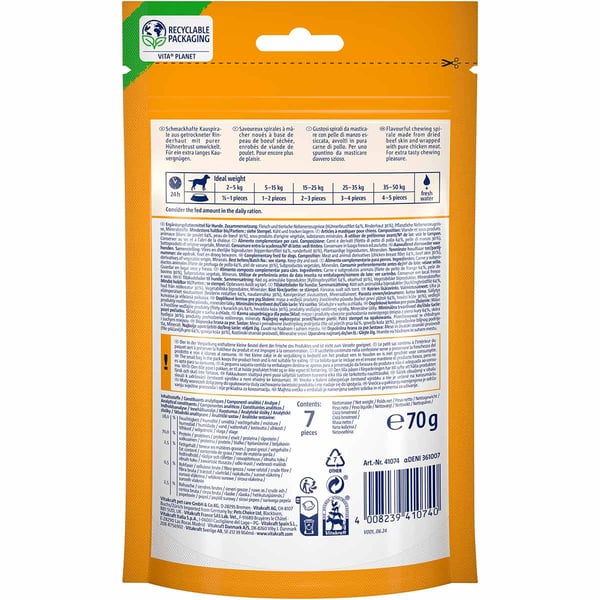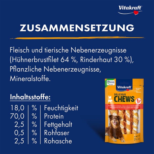 Mit den Vitakraft Delicious Chews Kauspiralen wird das Kauen zu einem wahren Erlebnis. Die einzigartige Kombination aus spiralförmiger Rinderhaut und einer Umhüllung aus zartem Hühnchen sorgt für doppelten Genuss. Dein Hund wird die neue Form lieben, die nicht nur für Abwechslung, sondern auch für langanhaltenden Kauspaß sorgt.