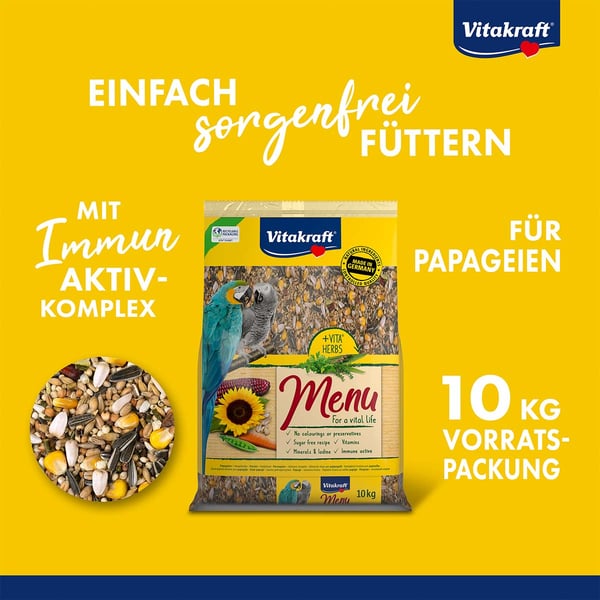 Mit Vitakraft Menu Papageien fütterst du einfach und sorgenfrei. Das Komplettfutter liefert alle notwendigen Nährstoffe und ist in verschiedenen Verpackungsgrößen erhältlich, um den individuellen Bedarf deiner Vögel zu decken. So bleibt der Vorrat stets gefüllt, und du kannst dich auf die wesentlichen Aspekte der Papageienhaltung konzentrieren.