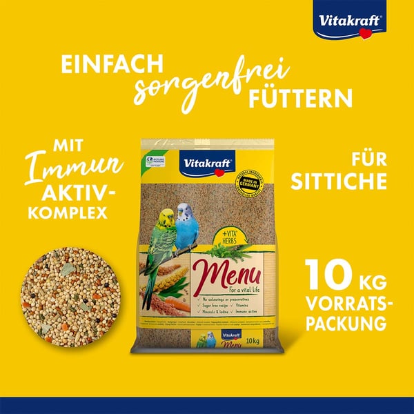Vitakraft Menu Sittich ist ein bewährtes Komplettfutter, das deinen Vögeln eine umfassende Versorgung bietet. Die sorgfältig abgestimmte Rezeptur enthält essenzielle Vitamine und Mineralien, die für ein vitales Vogelleben notwendig sind. Die natürlichen Zutaten werden ohne Zucker sowie künstliche Farb-, Aroma- und Konservierungsstoffe hergestellt, um eine hochwertige Ernährung sicherzustellen.