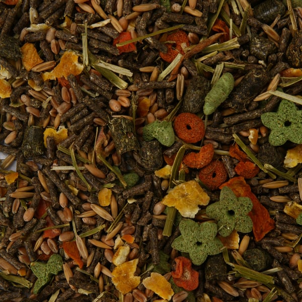 Pflanzliche Nebenerzeugnisse (Luzerne 10,6%), Getreide 41,6%, Gemüse (Kürbis, getrocknet 1%), Früchte (Apfel, getrocknet 1%), Mineralstoffe,