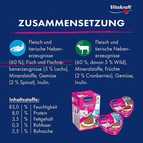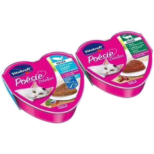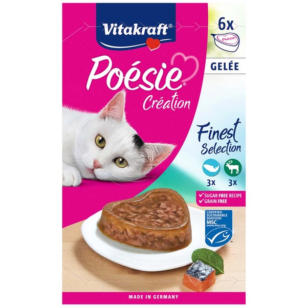 Der Vitakraft Poésie Multipack Herz Gelee MSC bietet eine perfekte Mischung aus Lachs und Wild, die speziell auf die Bedürfnisse von Katzen abgestimmt ist. Die Kombination aus hochwertigen Zutaten und sorgfältiger Zubereitung sorgt für eine ausgewogene Ernährung, die deine Katze lieben wird.