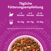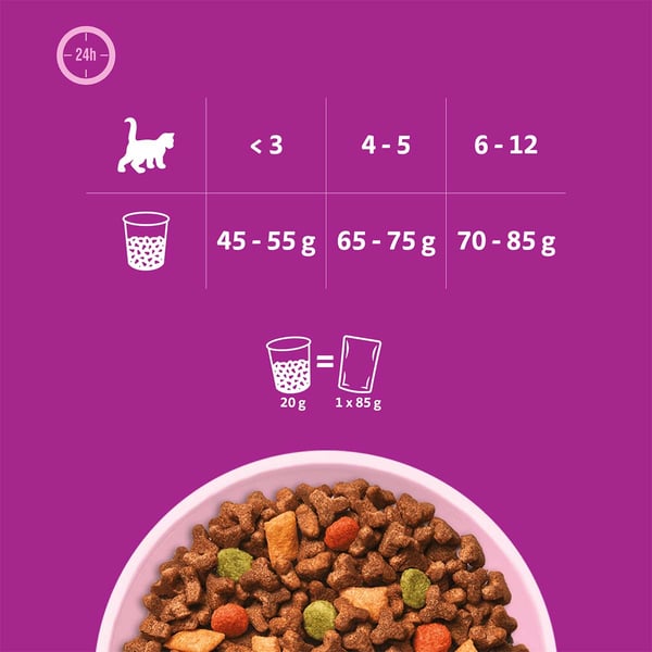 20 g Trockennahrung lässt sich durch 1 Portionsbeutel 85 g WHISKAS Feuchtnahrung ersetzen. Berücksichtigen Sie die Kalorien, die von Snacks stammen. Fütterungsmengen sind nur als Richtlinien gedacht. Passe die Fütterungsmenge entsprechend dem Alter, der Grösse und der Aktivität deines Kätzchens an. Verteilen Sie die Fütterungsportionen über den Tag hinweg. Bitte führen Sie das neue Futter schrittweise ein, wenn Sie die Ernährungsweise ändern. Für ausführlichere Informationen besuchen Sie bitte unsere Website. Stellen Sie frisches Trinkwasser bereit. Bitte beachten Sie die Fütterungstabelle auf der Verpackung für eine individuelle Anpassung für Ihr Tier.