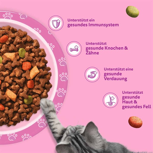 Trockenfutter wie Whiskas Junior mit Huhn kann das natürliche Fressverhalten deiner Katze fördern, da die Tagesration im Napf bleiben kann und dein Tier sich seine Futterzeiten selbst wählen kann. Achte jedoch darauf, dass deine Katze immer ausreichend Wasser zur Verfügung hat, da Trockenfutter nur wenig Wasser enthält.