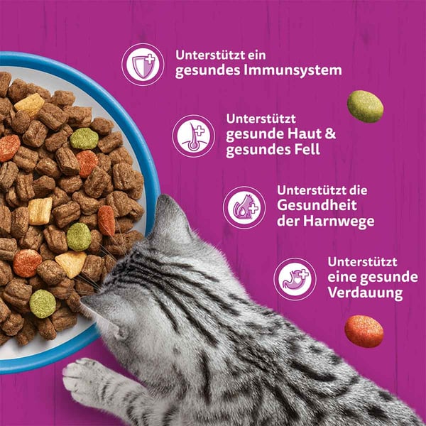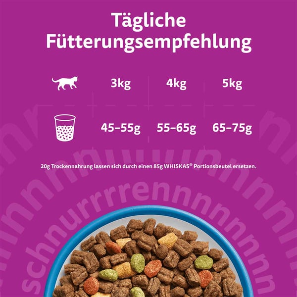 20 g Trockennahrung lässt sich durch 1 Portionsbeutel 85 g WHISKAS Feuchtnahrung ersetzen. Berücksichtigen Sie die Kalorien, die von Snacks stammen. Fütterungsmengen sind nur als Richtlinien gedacht. Passen Sie die Fütterungsmenge entsprechend dem Alter, der Grösse und der Aktivität Ihrer Katze an. Verteilen Sie die Fütterungsportionen über den Tag hinweg. Bitte führen Sie das neue Futter schrittweise ein, wenn Sie die Ernährungsweise ändern. Für ausführlichere Informationen besuchen Sie bitte unsere Website. Stellen Sie frisches Trinkwasser bereit. Bitte beachten Sie die Fütterungstabelle auf der Verpackung für eine individuelle Anpassung für Ihr Tier.