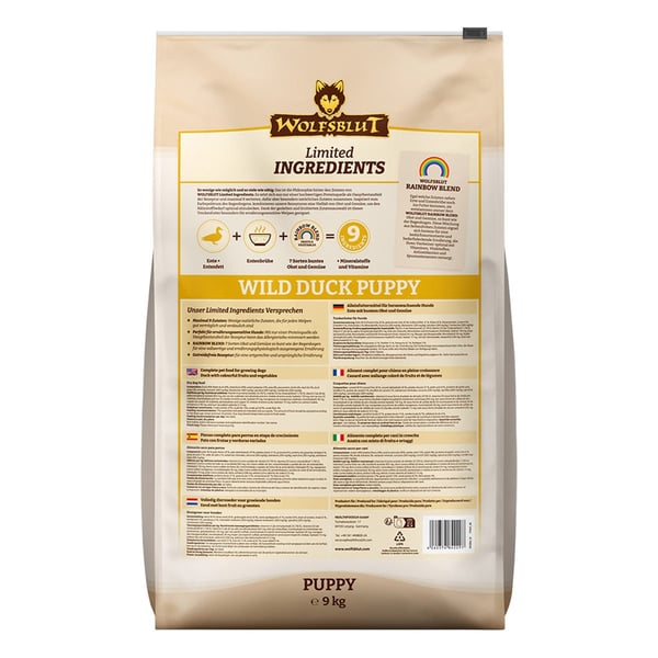 Diese besondere Rezeptur enthält nicht mehr als 9 hochwertige Zutaten: Die erste Zutat ist die Proteinquelle, hochwertiger Ente und Entenfett kombiniert mit Entenbrühe und einem erlesenen Mix aus 7 Sorten buntem Obst und Gemüse – der RAINBOW BLEND. Dieser einzigartige RAINBOW BLEND, so bunt wie der Regenbogen selbst, stellt die optimale Ernährung deines jungen Hundes sicher.