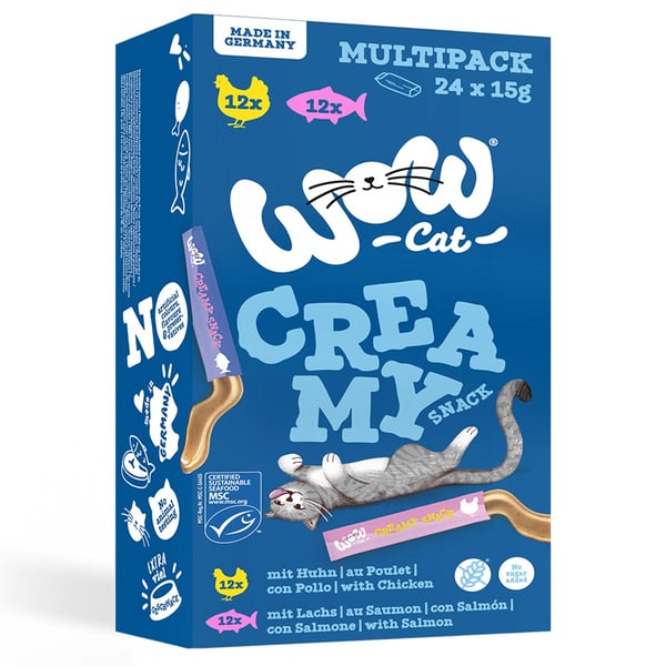 Das WOW CAT Creamy Snack Multipack bietet deiner Katze eine abwechslungsreiche Mischung aus zartem Huhn und schmackhaftem Lachs. Jede Portion ist einzeln verpackt und lässt sich direkt aus dem Sachet schlecken, als Topping verwenden oder im Napf servieren. Die natürliche Rezeptur ohne Zusatz von Zucker und Salz sorgt für ein leckeres Erlebnis.