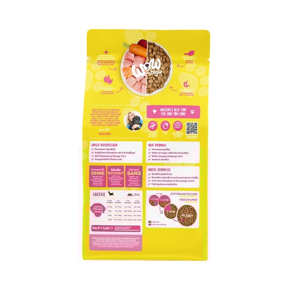 Mit einem optimalen Calcium-Phosphor-Verhältnis von 1,65 : 1 fördert WOW DOG TROCKEN Minis JUNIOR Geflügel die Entwicklung von starken Knochen und Muskeln. Die ausgewogene Rezeptur mit Kräutern und Mineralstoffen sorgt dafür, dass dein Welpe alles bekommt, was er für seine täglichen Abenteuer benötigt. So wird jeder Tag zu einem Erlebnis für deinen jungen Vierbeiner.