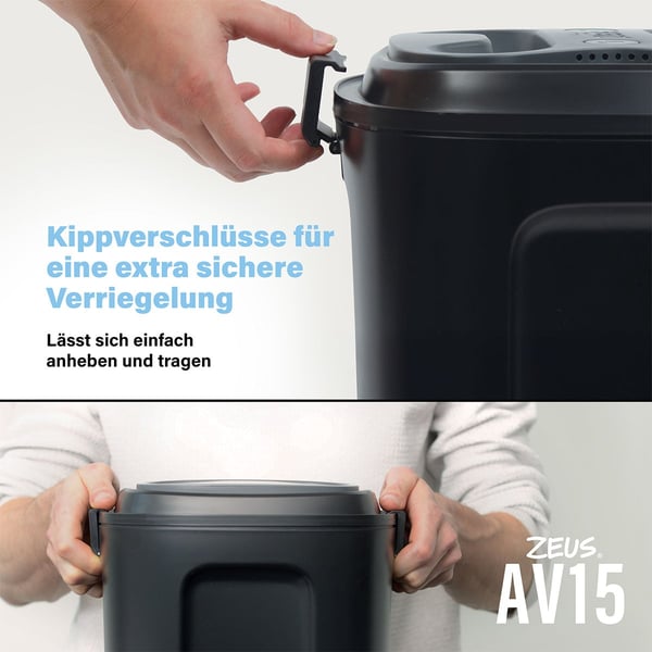 Mit einem Fassungsvermögen von 15 Litern bietet der Zeus AV15 ausreichend Platz für die Futtervorräte deines Hundes. Der Behälter besteht aus lebensmittelechten Materialien und verfügt über robuste Verschlüsse, die auch unterwegs sicheren Halt gewährleisten. Dank der glatten Innenfläche lässt sich der Behälter leicht reinigen, während der knochenförmige Deckelgriff eine einfache Handhabung ermöglicht.