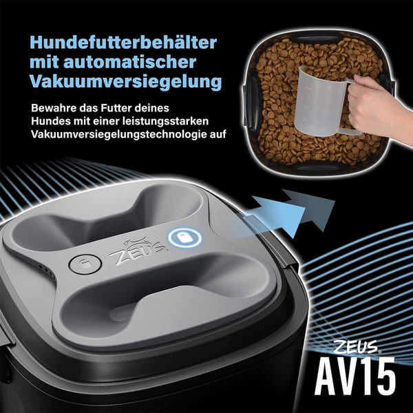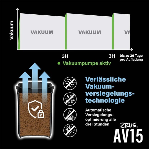 Der Zeus AV15 Vakuum Hundefutterbehälter bietet eine effektive Lösung zur Konservierung von Hundefutter. Die Vakuumversiegelung entfernt die meiste Luft aus dem Inneren des Behälters, wodurch die Frische des Futters bewahrt wird. Dies schützt zuverlässig vor äußeren Einflüssen wie Feuchtigkeit und Ungeziefer. Die regelmäßige Überprüfung und Verstärkung der Versiegelung alle drei Stunden sorgt für gleichbleibende Bedingungen.
