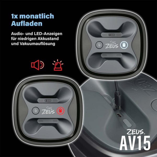 Der Zeus AV15 überzeugt durch seine benutzerfreundlichen Bedienelemente und die Möglichkeit, ihn sowohl am Stromnetz angeschlossen als auch autark zu betreiben. Mit einer Akkulaufzeit von bis zu 36 Tagen ist er flexibel einsetzbar. Die integrierten Audio- und LED-Anzeigen informieren dich rechtzeitig über den Batteriestand und die Vakuumauflösung, sodass du stets den Überblick behältst.